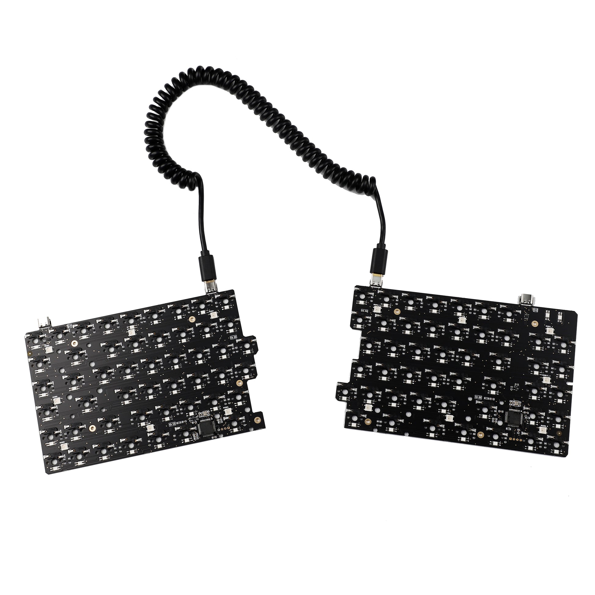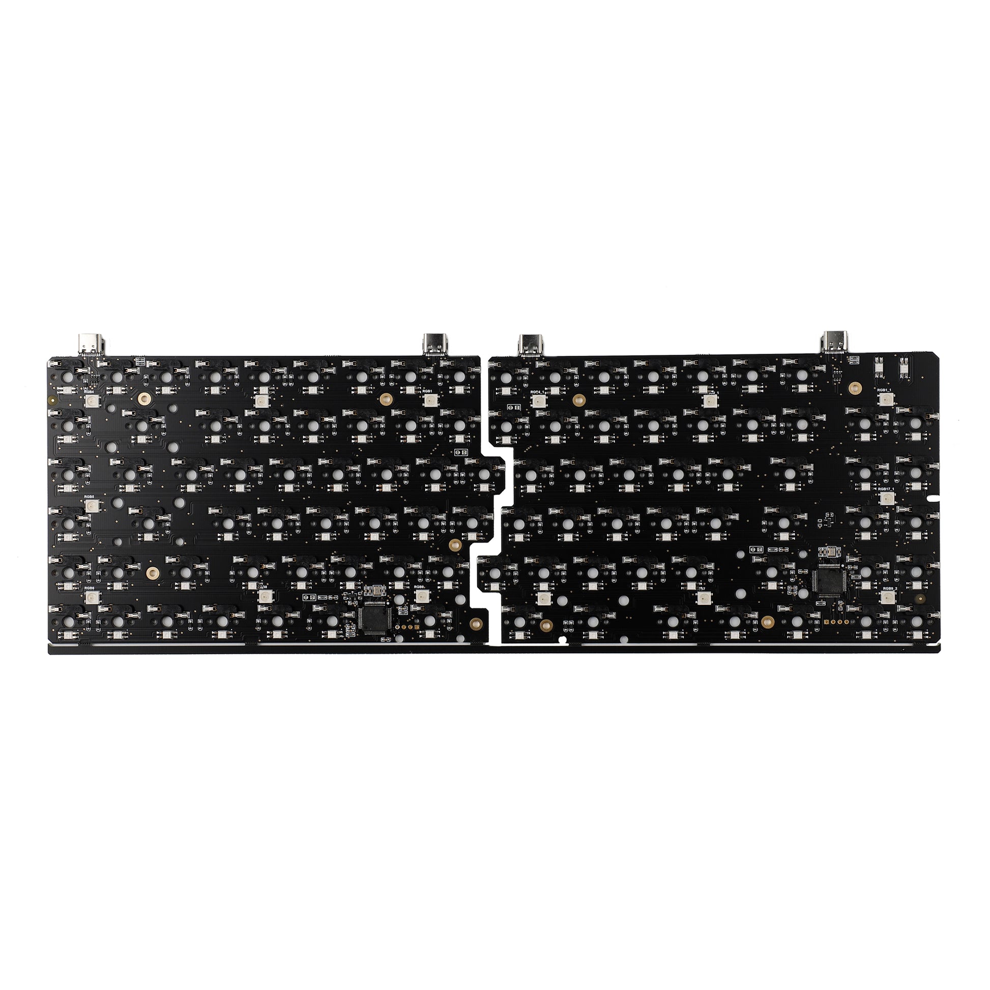 This Keyboard use stm 401 chipset whose flash memory is 256k.There are chipset on both left and right PCB.We also designed 2 USB C port on both left and right PCB for different customers’ preference.Middle 2 ones are used to connect 2 PCB halves.Far Left and right ones are used to connect to PC.